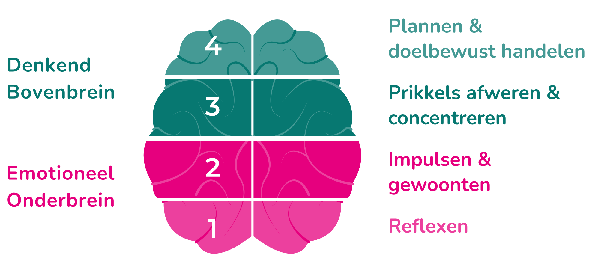 Om te begrijpen wat er gebeurt in de hersenen, onderscheiden we binnen Omgevingszorg twee soorten hersenfuncties: het emotionele brein en het denkende (cognitieve) brein.